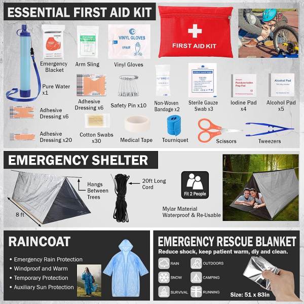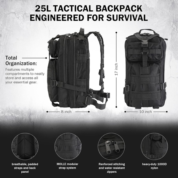 Az All-in-One taktikai túlélési hátizsák elsősegély-készlet szabadtéri kalandozóknak, vészhelyzeti felkészültségnek és katasztrófaelhárításnak készült. Tartós, katonai stílusú hátizsákba csomagolva egyetlen komplett megoldásban egyesíti a nélkülözhetetlen túlélési eszközöket, az elsősegély-felszereléseket és a vészhelyzeti felszereléseket.
