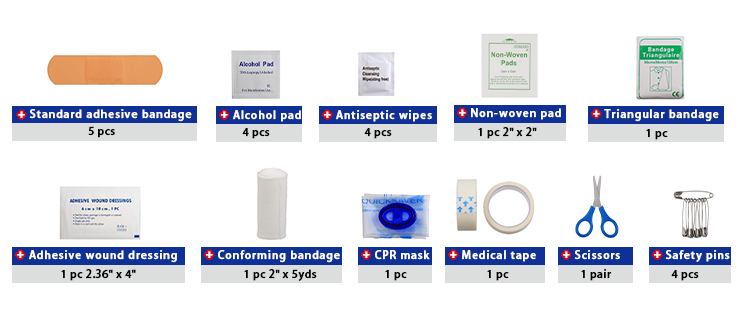 Tartalmazza az alapvető elsősegélynyújtási eszközöket kisebb sérülések és napi használat esetén