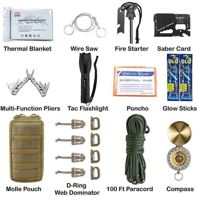 A Military Tactical 72H Emergency Survival Kit elsősegélynyújtó orvosi kellékeket és gyakorlati eszközöket tartalmaz szabadtéri utazásokhoz, kempingezéshez és egyéb forgatókönyvekhez, amelyek megfelelnek az orvosi és szabadtéri szórakozás igényeinek. A vészhelyzeti túlélőtáska csattal rendelkezik, amely az övre vagy a hátizsákra akasztható, így könnyen hordozható. Belső rekeszek a könnyű hozzáférés érdekében.